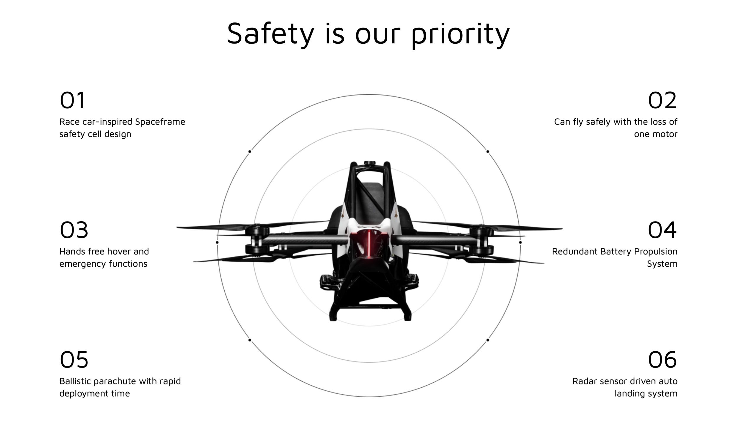 The machine has eight motors and can still fly safely and land with the loss of one motor: