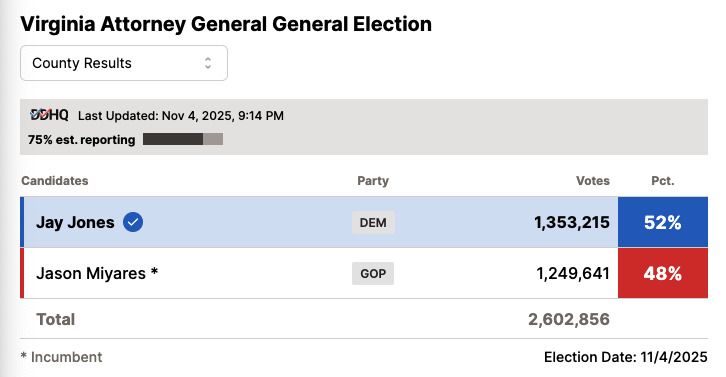 Currently, Jay Jones is winning the race with 52% of the vote, compared to Republican Jason Miyares’ 48% of the vote.