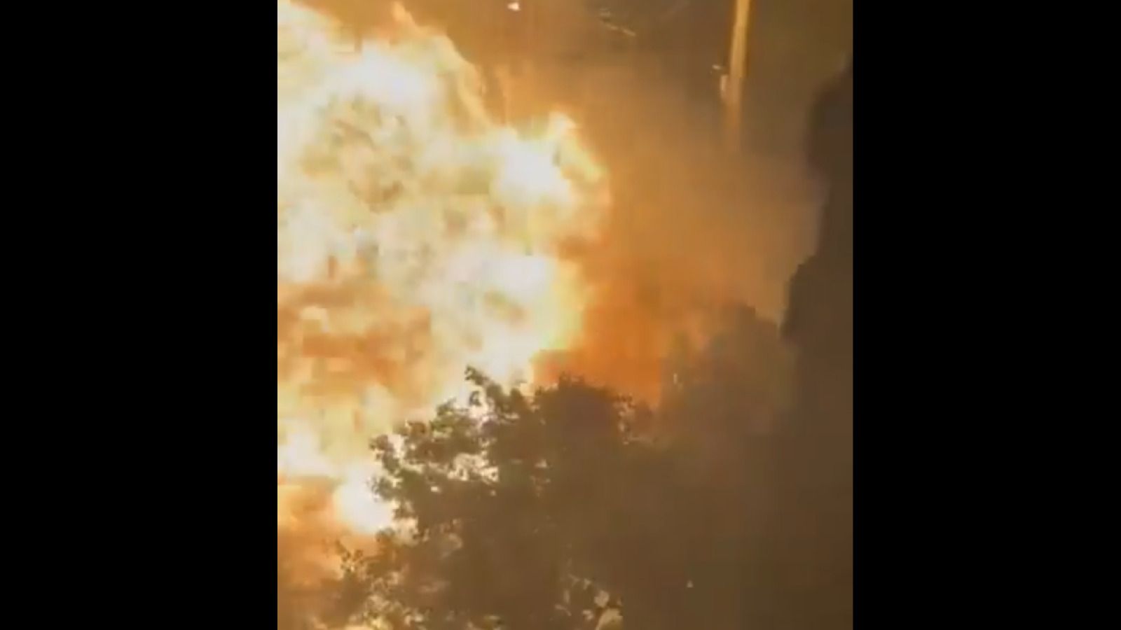 The explosion was captured in jaw-dropping footage that shows billowing flames and plumes of smoke towering over the street.