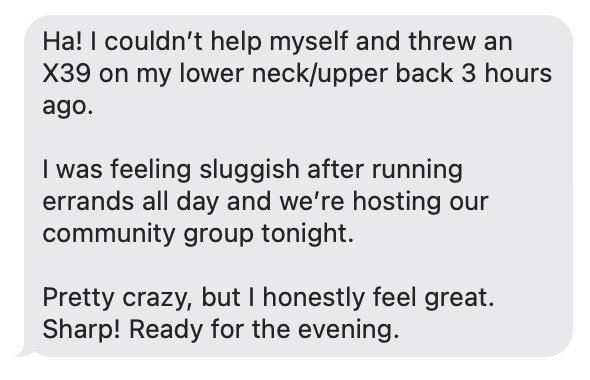 The daily x39 patch also kicked in almost immediately. It's not a jittery, caffeine type buzz, but I did notice similar effects: more energy all day long, increased focus. Less pain in joints. And then I started realizing that I had more stamina when I would go out on a run, which I try to do about 5 days a week. I was hitting that runner's groove earlier and staying in it longer.