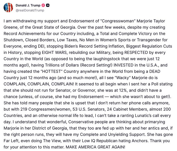 President Trump had finally had enough today, withdrawing his endorsement and putting MTG on blast on Truth Social: