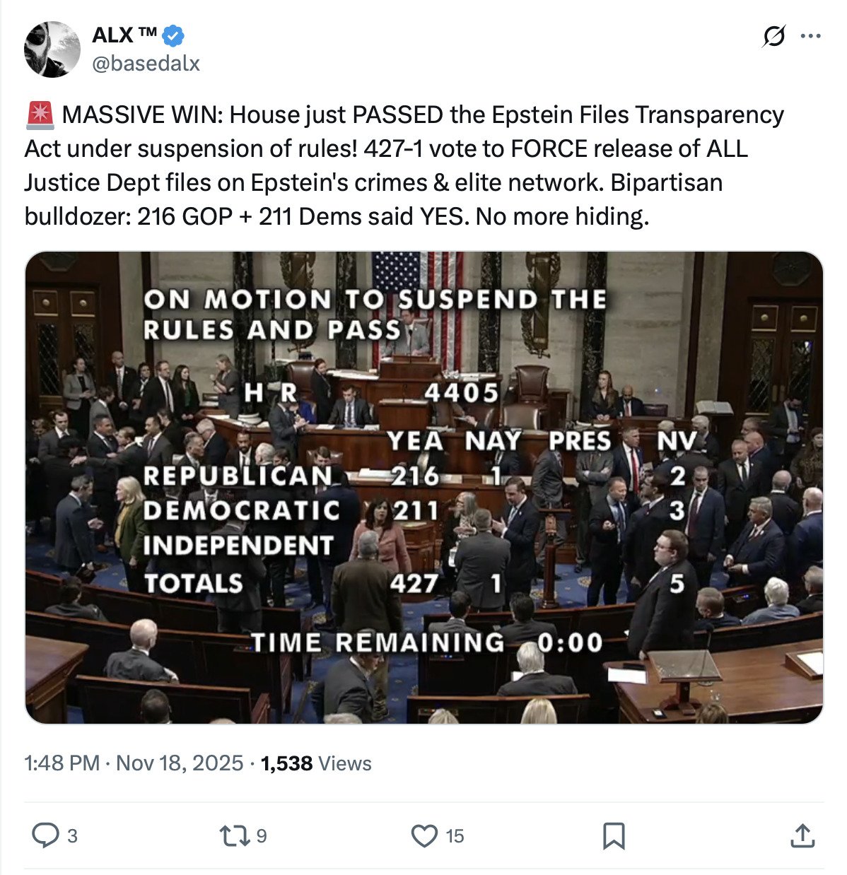 🚨 MASSIVE WIN: House just PASSED the Epstein Files Transparency Act under suspension of rules! 427-1 vote to FORCE release of ALL Justice Dept files on Epstein's crimes & elite network. Bipartisan bulldozer: 216 GOP + 211 Dems said YES. No more hiding. pic.twitter.com/1IoggwjkmU
