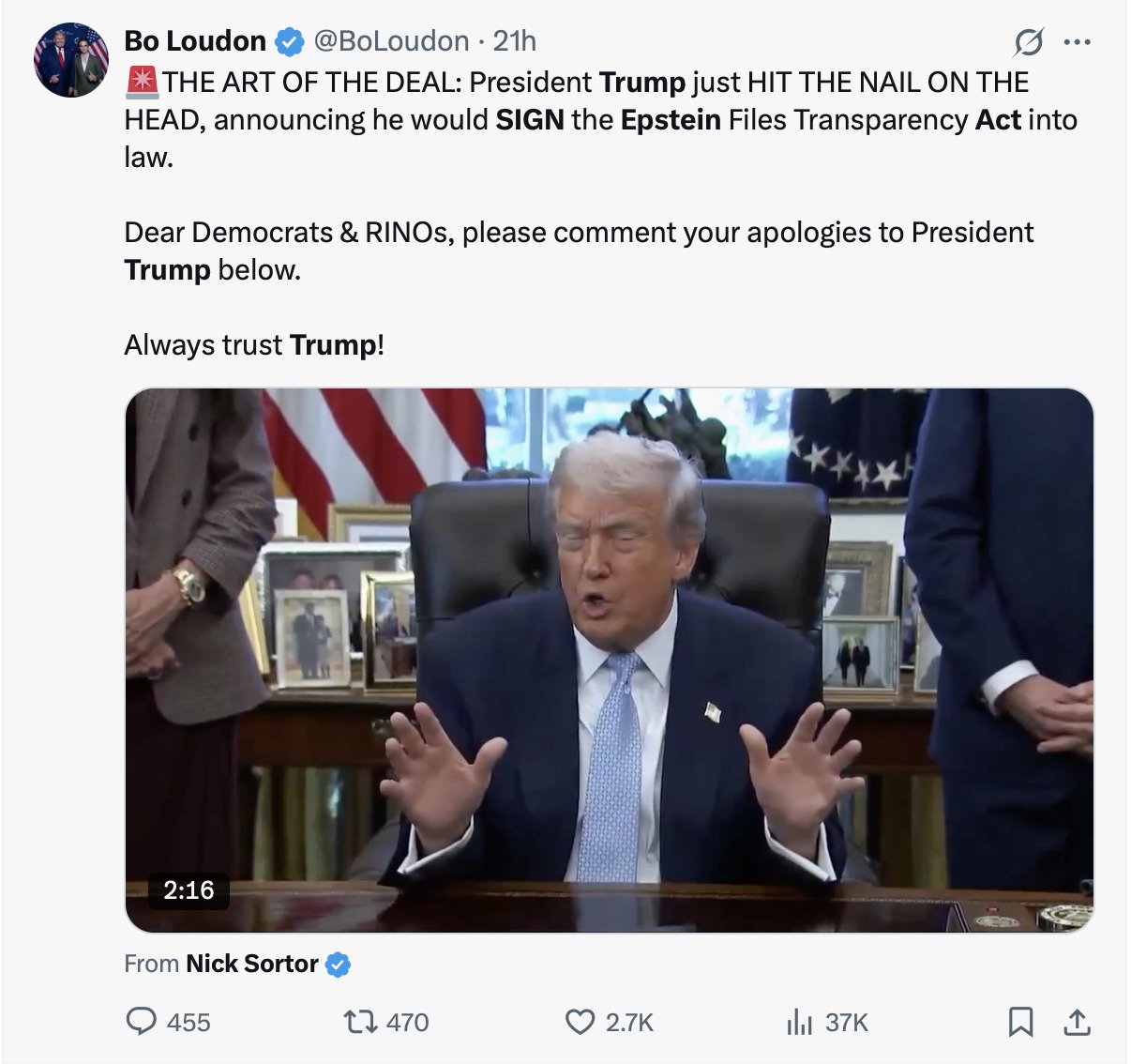 🚨THE ART OF THE DEAL: President Trump just HIT THE NAIL ON THE HEAD, announcing he would SIGN the Epstein Files Transparency Act into law.