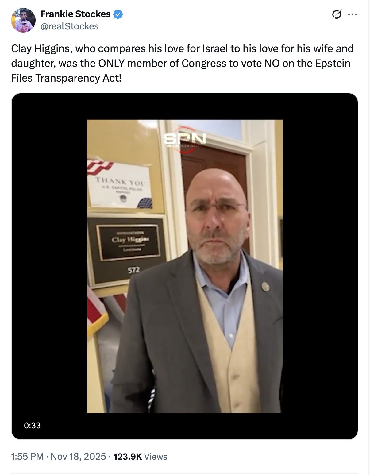 Clay Higgins, who compares his love for Israel to his love for his wife and daughter, was the ONLY member of Congress to vote NO on the Epstein Files Transparency Act! pic.twitter.com/ltIKmv6NUm