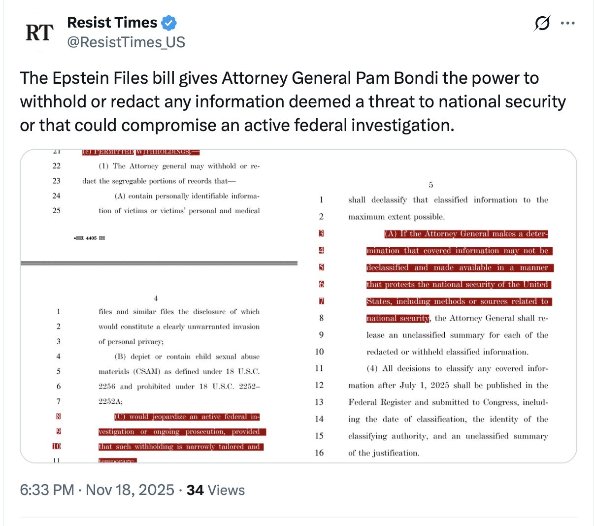 The Epstein Files bill gives Attorney General Pam Bondi the power to withhold or redact any information deemed a threat to national security or that could compromise an active federal investigation. pic.twitter.com/ZwedoehOZE