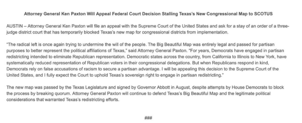 “The radical left is once again trying to undermine the will of the people. The Big Beautiful Map was entirely legal and passed for partisan purposes to better represent the political affiliations of Texas. For years, Democrats have engaged in partisan redistricting intended to eliminate Republican representation. Democratic states across the country, from California to Illinois to New York, have systematically reduced representation of Republican voters in their congressional delegations,” Paxton said.