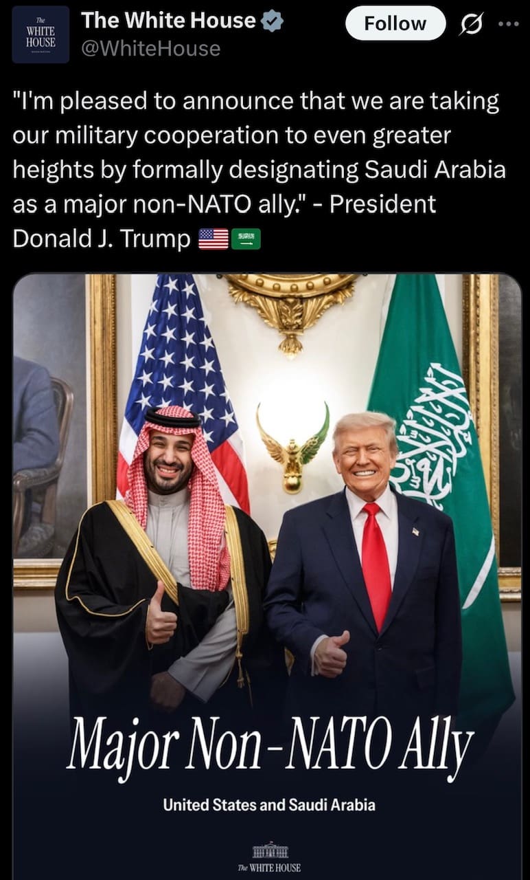 President Trump announced on Tuesday that the United States will designate Saudi Arabia as a “major non-NATO ally.”