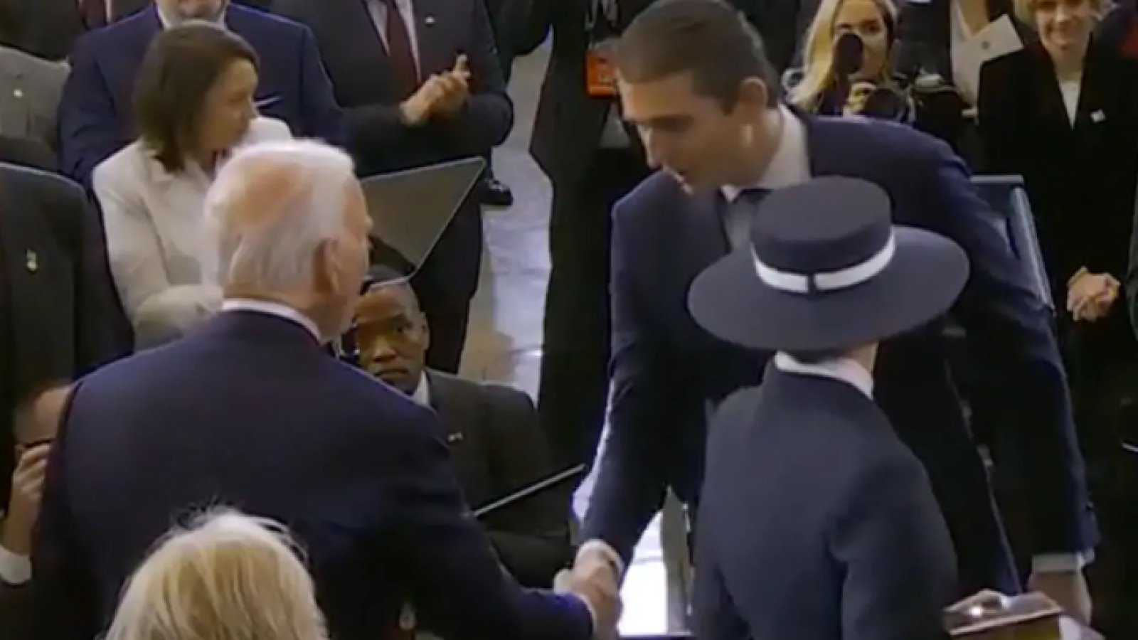 During the inauguration, the hulking Trump scion had approached Biden, 82, and shook hands with him before leaning in and muttering something mysterious to the outgoing leader — sending the internet aflutter with speculation.