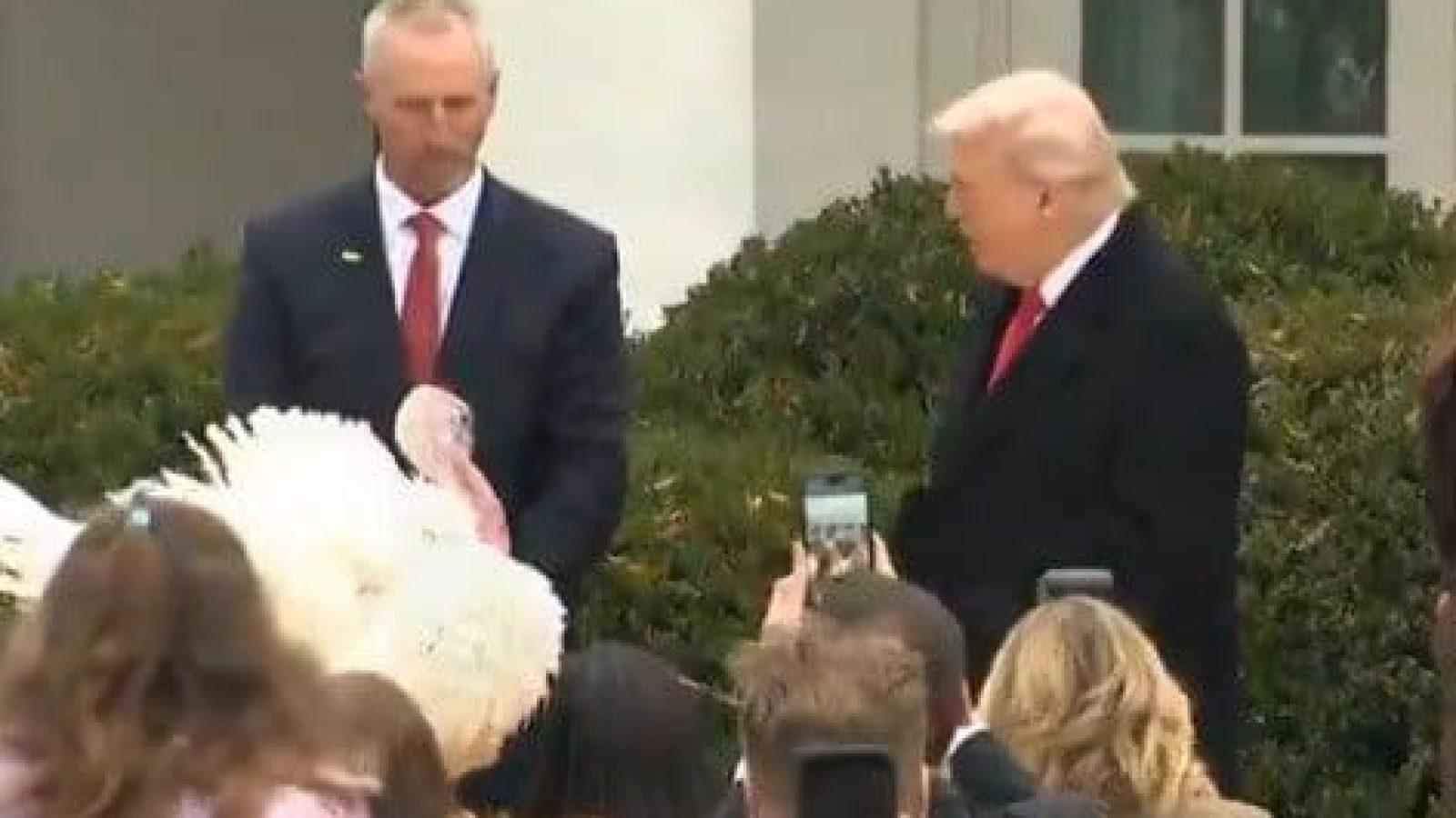 While standing outside of the White House President Trump pardoned two turkeys named “Gobble” and “Waddle.”