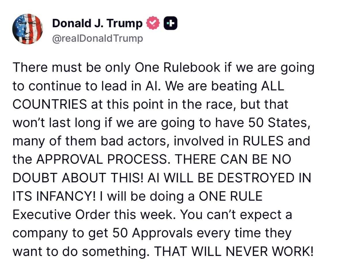 “There must be only One Rulebook if we are going to continue to lead in AI. We are beating ALL COUNTRIES at this point in the race, but that won’t last long if we are going to have 50 States, many of them bad actors, involved in RULES and the APPROVAL PROCESS. THERE CAN BE NO DOUBT ABOUT THIS! AI WILL BE DESTROYED IN ITS INFANCY!” Trump said.