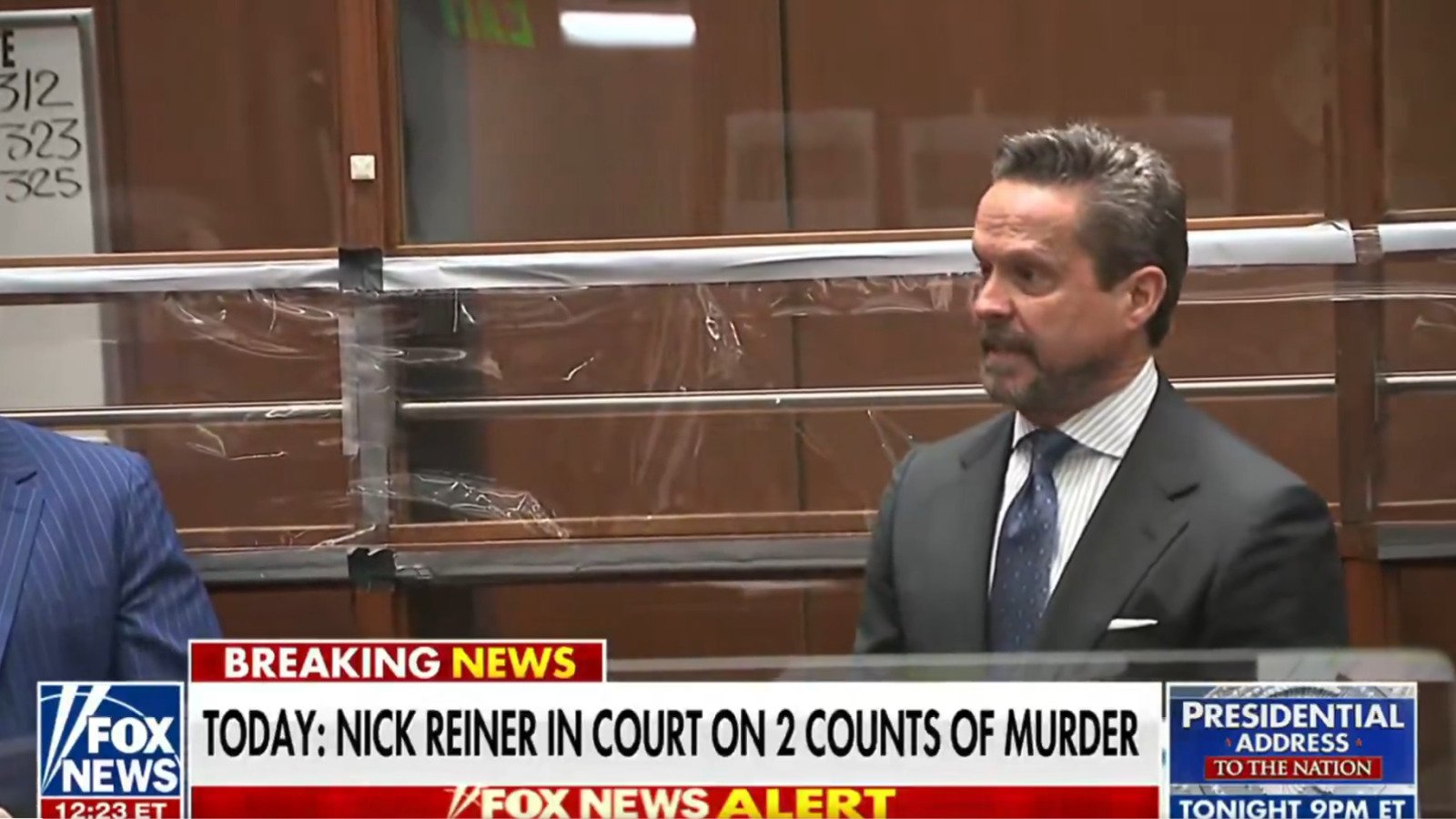 Flanked by his attorney, Alan Jackson, and two other lawyers, Reiner was barely visible from the courtroom gallery during the brief hearing. He donned a blue suicide prevention smock frequently worn by defendants who pose a risk of self-harm.
