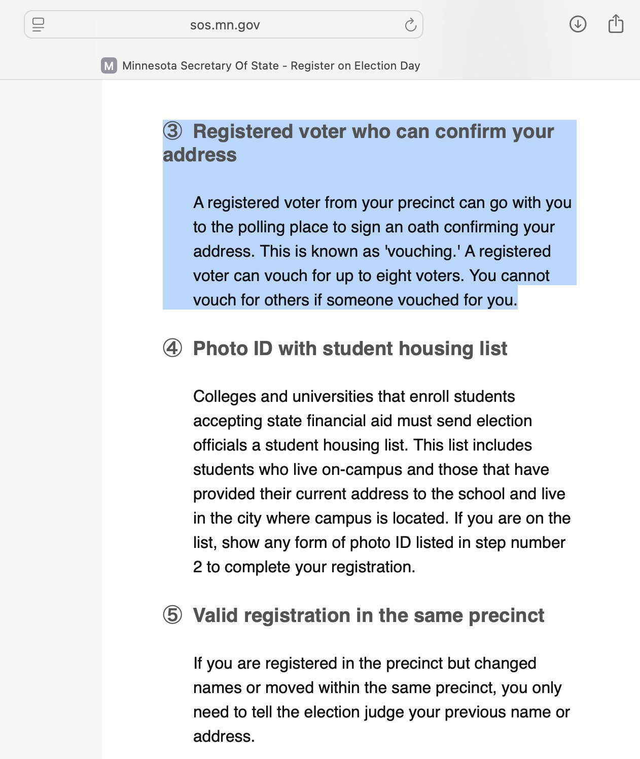 Yes, this is accurate based on Minnesota's official election rules. A registered voter in the precinct can vouch for up to eight others without ID during same-day registration by signing an oath confirming their address. Source: MN Secretary of State.