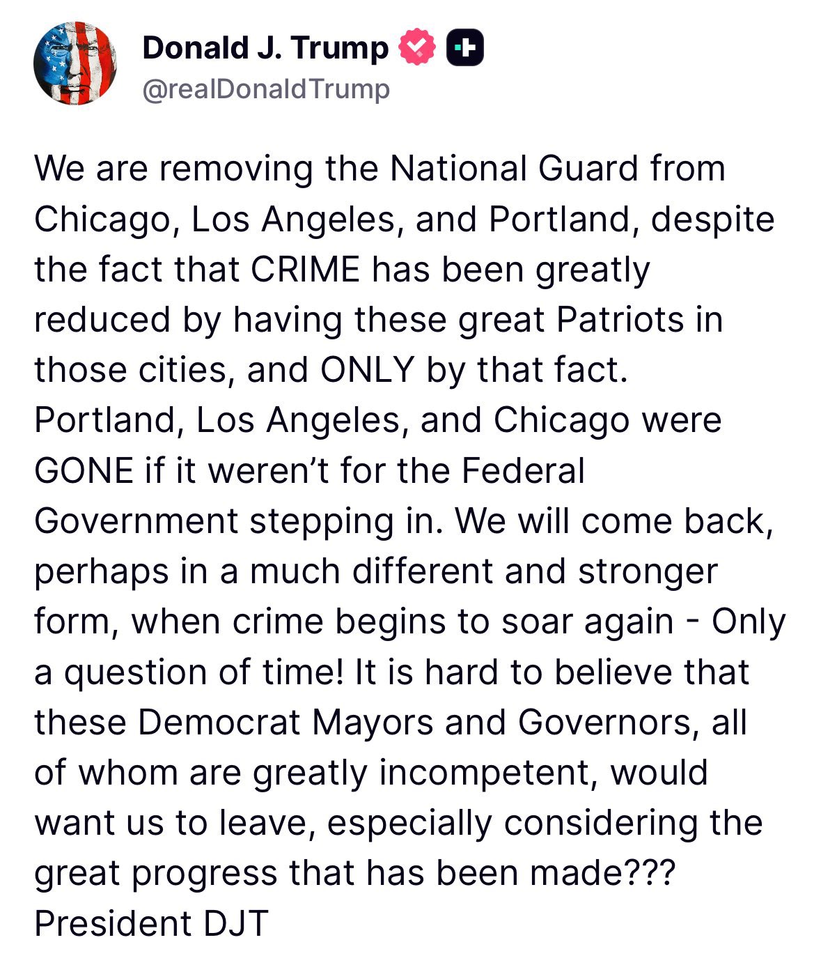 Trump just said he is removing the National Guard from Chicago, LA, and Portland, but says “we will come back, perhaps in a much different and stronger form”.