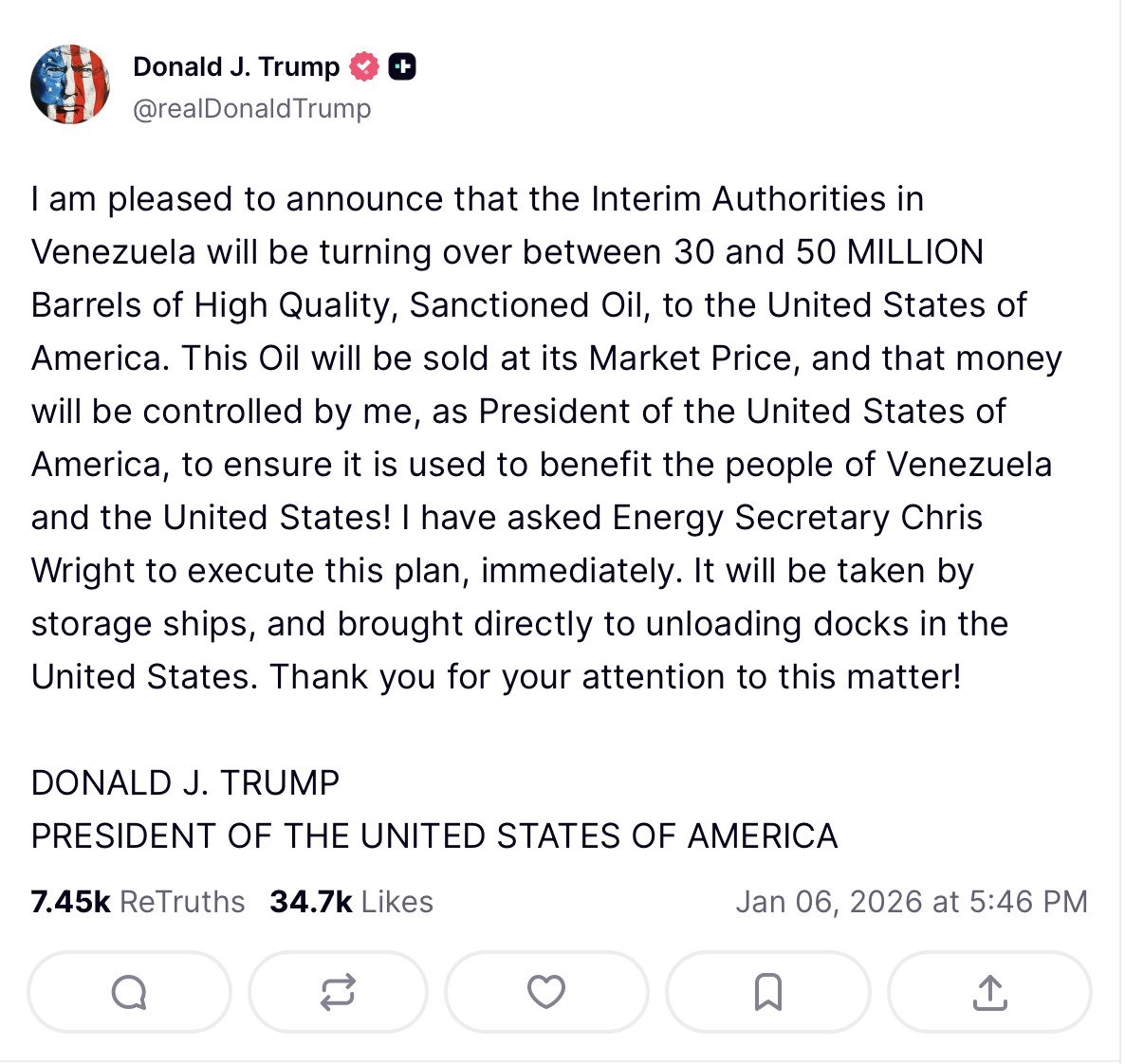 I am pleased to announce that the Interim Authorities in Venezuela will be turning over between 30 and 50 MILLIONÂ Barrels of High Quality, Sanctioned Oil, to the United States of America. This Oil will be sold at its Market Price, and that money will be controlled by me, as President of the United States of America, to ensure it is used to benefit the people of Venezuela and the United States! I have asked Energy Secretary Chris Wright to execute this plan, immediately. It will be taken by storage ships, and brought directly to unloading docks in the United States. Thank you for your attention to this matter!