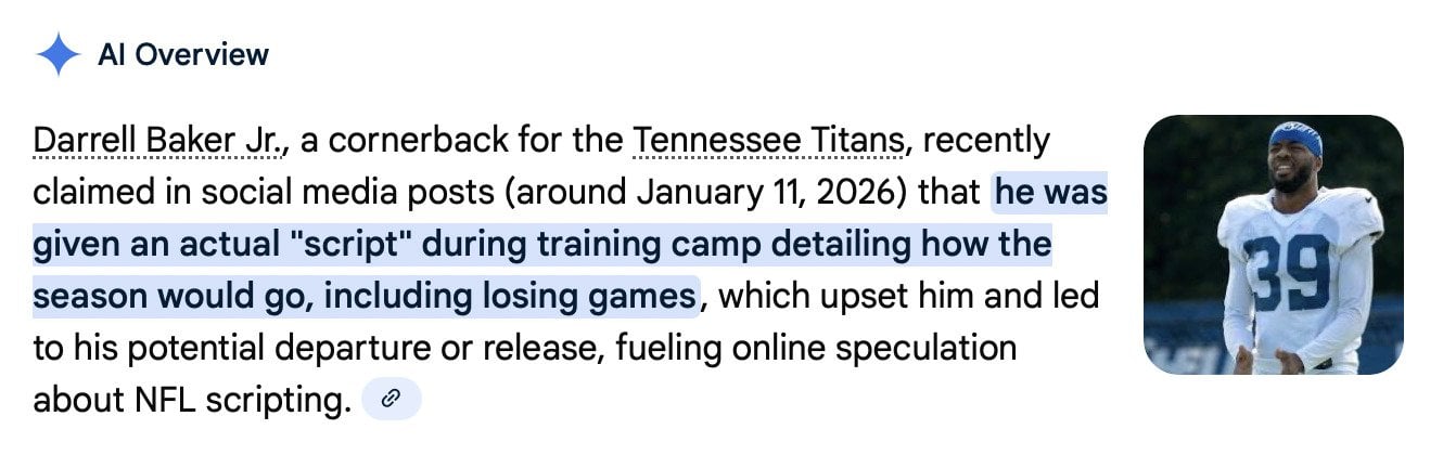 The video appears to be authentic and unaltered based on available sources—it’s a clip from what looks like a casual video call or recording, showing Darrell Baker Jr. (a Tennessee Titans cornerback) responding to a question about whether the NFL provides players with a “script” for the season. In it, he hesitates, scratches his head, and says yes, describing getting a script during training camp that outlines outcomes, including an early end to the season (implying no playoffs, with references to packing for vacations like Cancun or Cabo). He expresses mock frustration about knowing the results in advance.However, Baker himself later clarified on X that the statement was a joke and he was trolling.