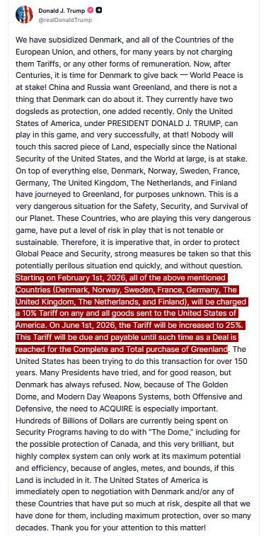 On June 1st, 2026, the Tariff will be increased to 25%. This Tariff will be due and pay reached for the Complete and Total purchase of Greenland.