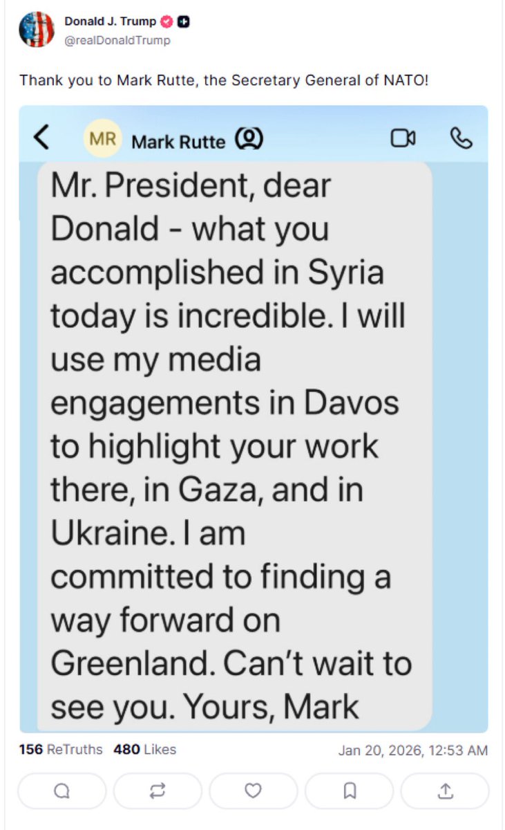 Mark RutteMr. President, dear Donald – what you accomplished in Syria today is incredible. I will use my media engagements in Davos to highlight your work there, in Gaza, and in Ukraine. I am committed to finding a way forward on Greenland. Can’t wait to see you. Yours, Mark