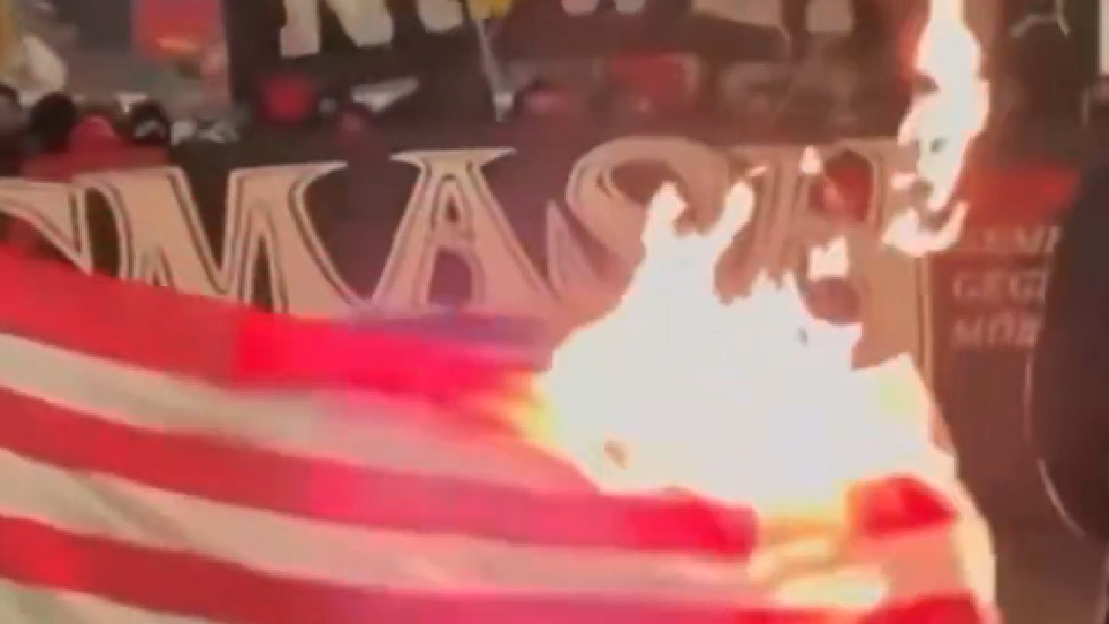 Videos on X show protesters in the street holding anti-Trump signs, and further show masked men burning an American flag.