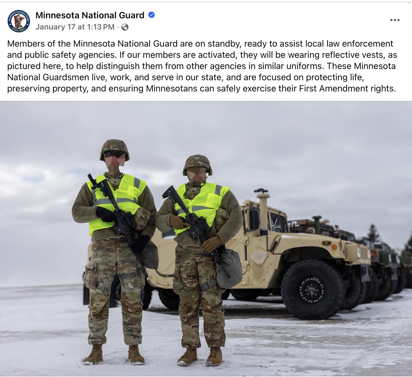 Members of the Minnesota National Guard are on standby, ready to assist local law enforcement and public safety agencies. If our members are activated, they will be wearing reflective vests, as pictured here, to help distinguish them from other agencies in similar uniforms. These Minnesota National Guardsmen live, work, and serve in our state, and are focused on protecting life, preserving property, and ensuring Minnesotans can safely exercise their First Amendment rights.