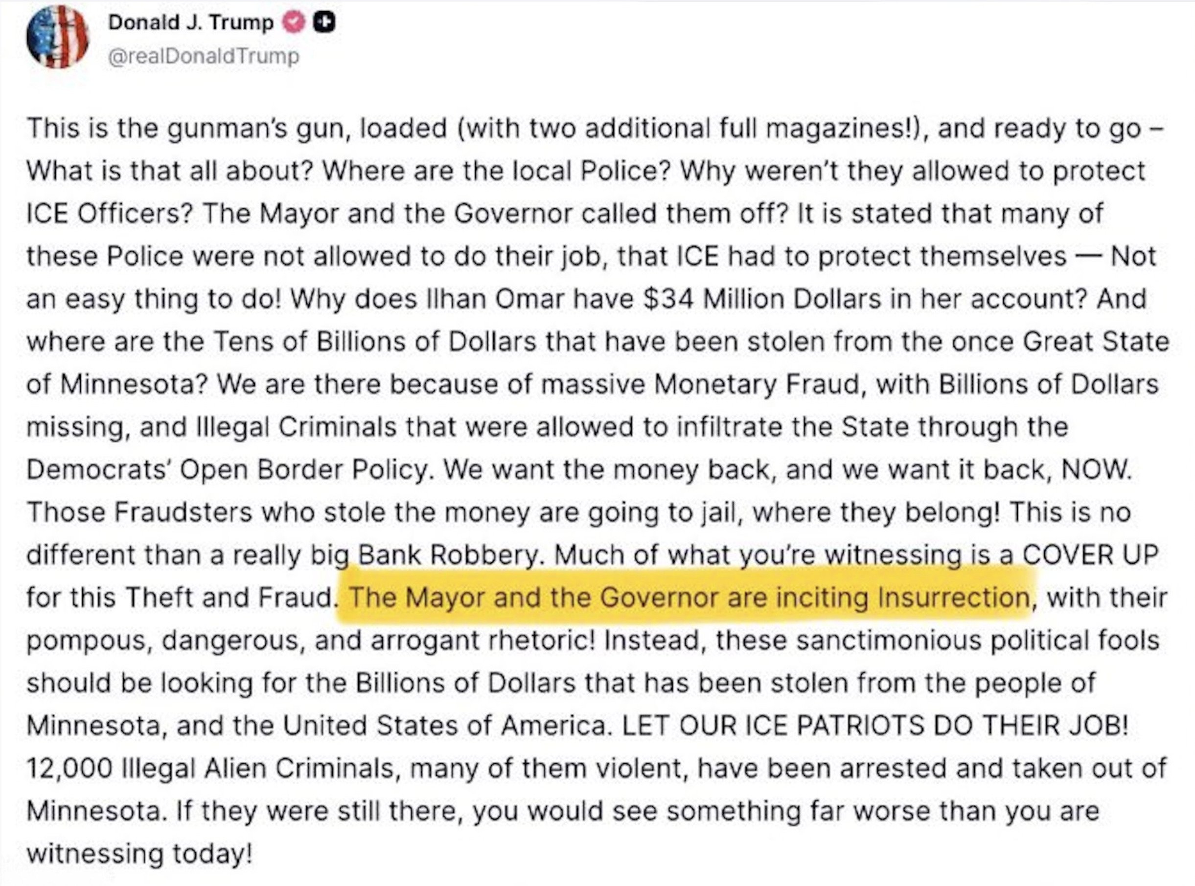 In a new TruthSocial post just posted by our President just a few hours ago, in response to the fatal shooting today in Minnesota and in response to an ICE agent literally getting his finger bitten off by a raged lunatic, President Trump just called it out: “The Mayor and the Governor are inciting Insurrection”.