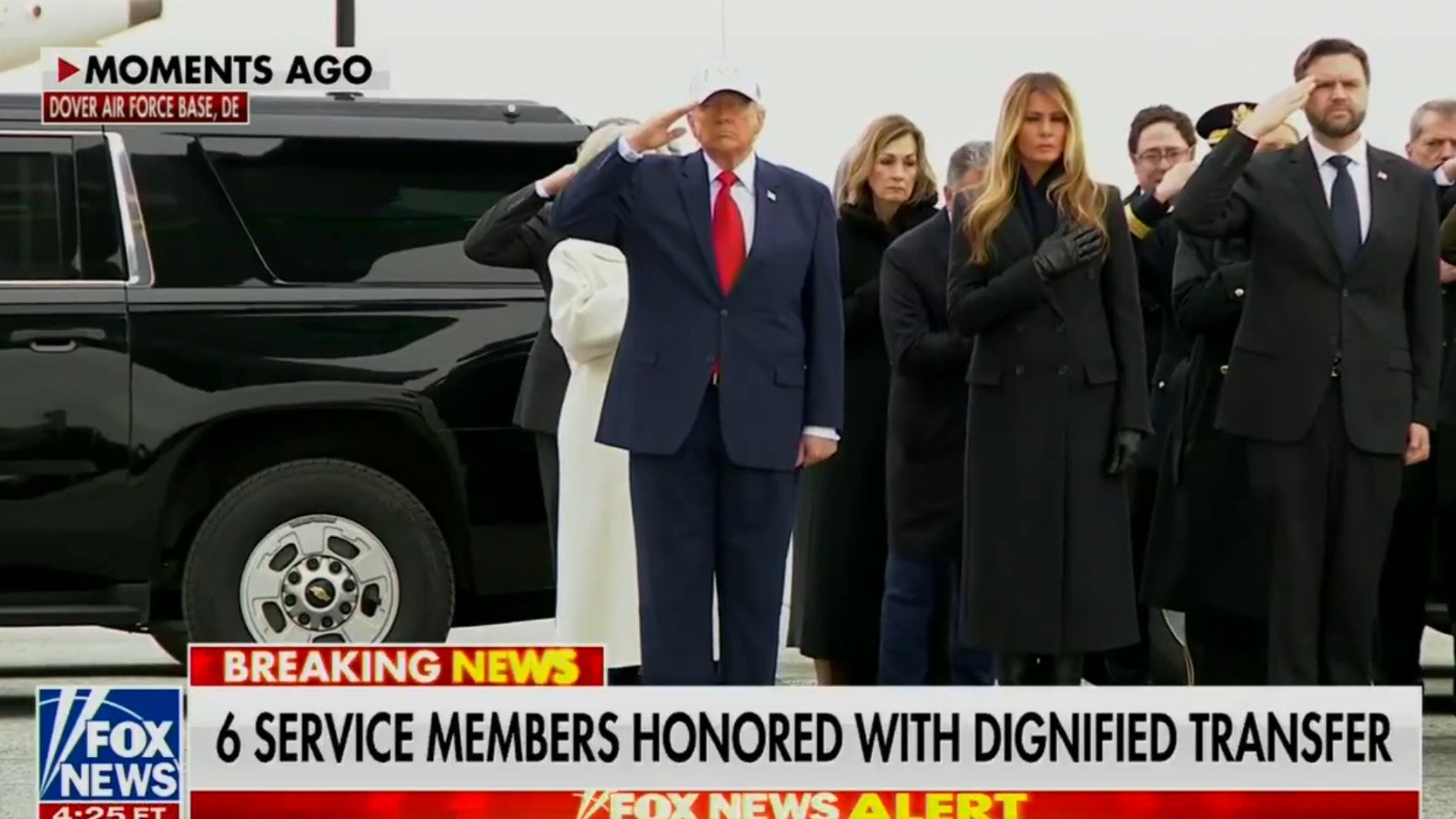 NOW: President Trump and VP JD Vance stand by and salute as each casket carrying one of our six fallen service members is taken off the plane at Dover Air Force Base