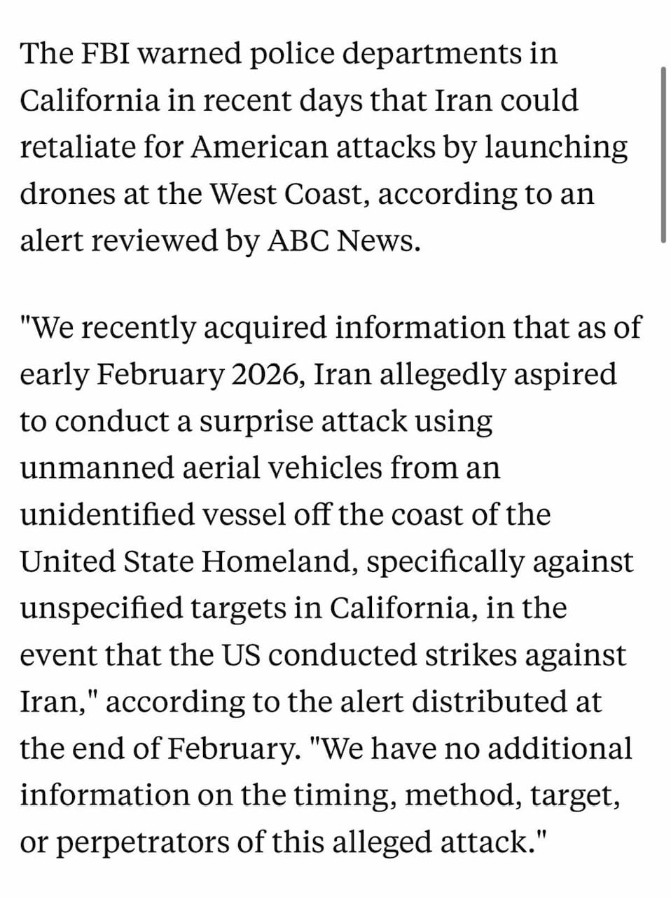 “We recently acquired information that as of early February 2026, Iran allegedly aspired to conduct a surprise attack using unmanned aerial vehicles from an unidentified vessel off the coast of the United State Homeland, specifically against unspecified targets in California, in the event that the US conducted strikes against Iran. We have no additional information on the timing, method, target, or perpetrators of this alleged attack.”