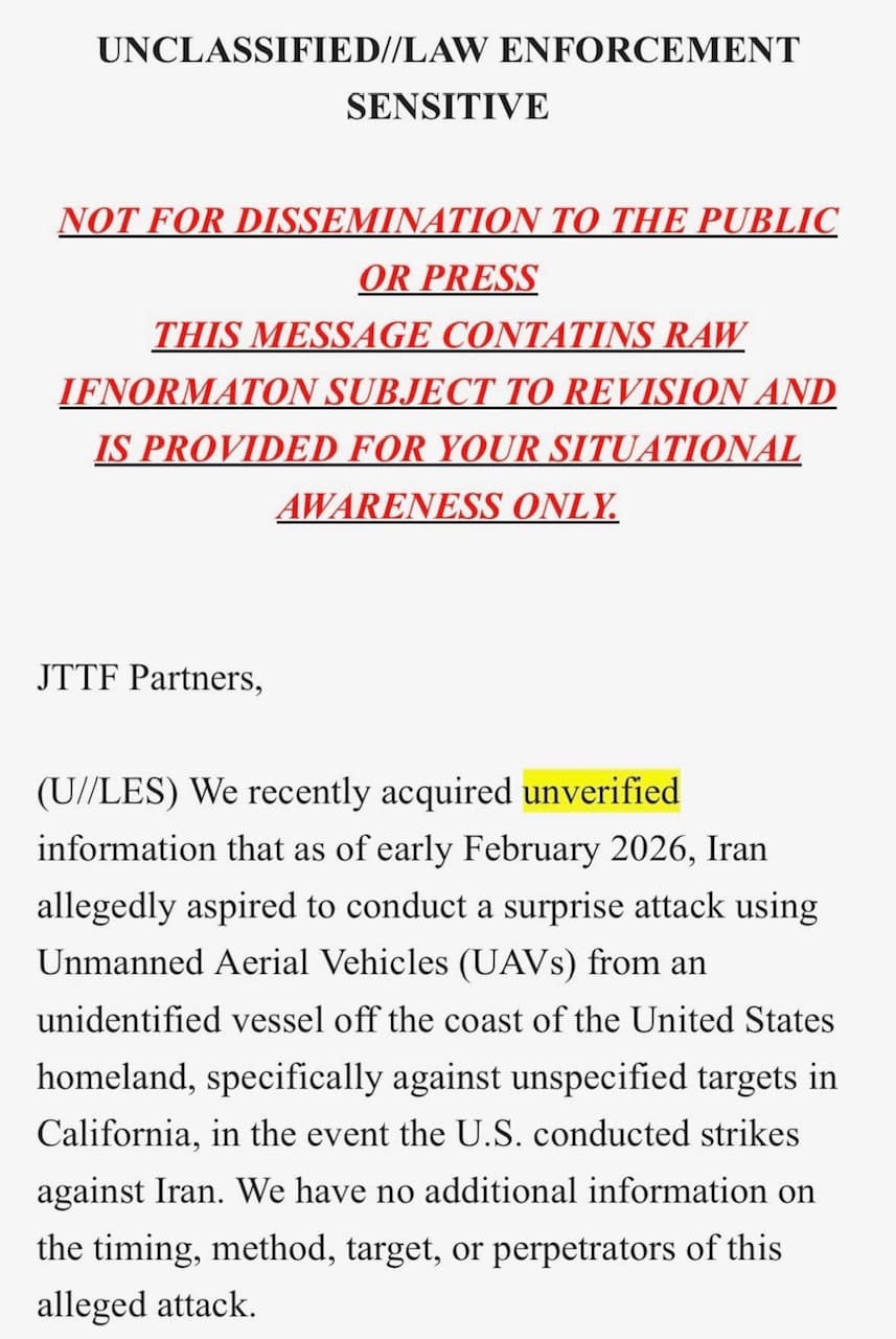 “We recently acquired unverified information that as of early February 2026, Iran allegedly aspired to conduct a surprise attack using Unmanned Aerial Vehicles (UAVs) from an unidentified vessel off the coast of the United States homeland, specifically against unspecified targets in California, in the event the U.S. conducted strikes against Iran. We have no additional information on the timing, method, target, or perpetrators of this alleged attack.”