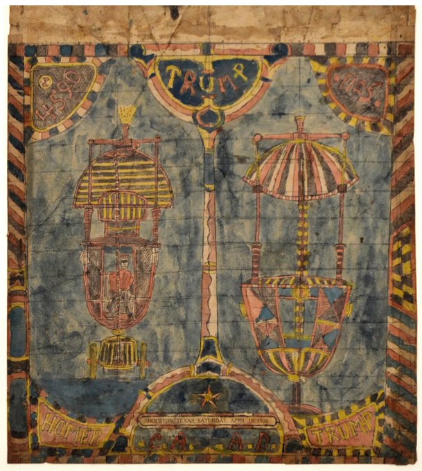 Illustration of two elaborate aircraft, one containing a pilot, with the word “TRUMP” visible in multiple places and text indicating “Houston, Texas, Saturday, April 10, 1920.”
