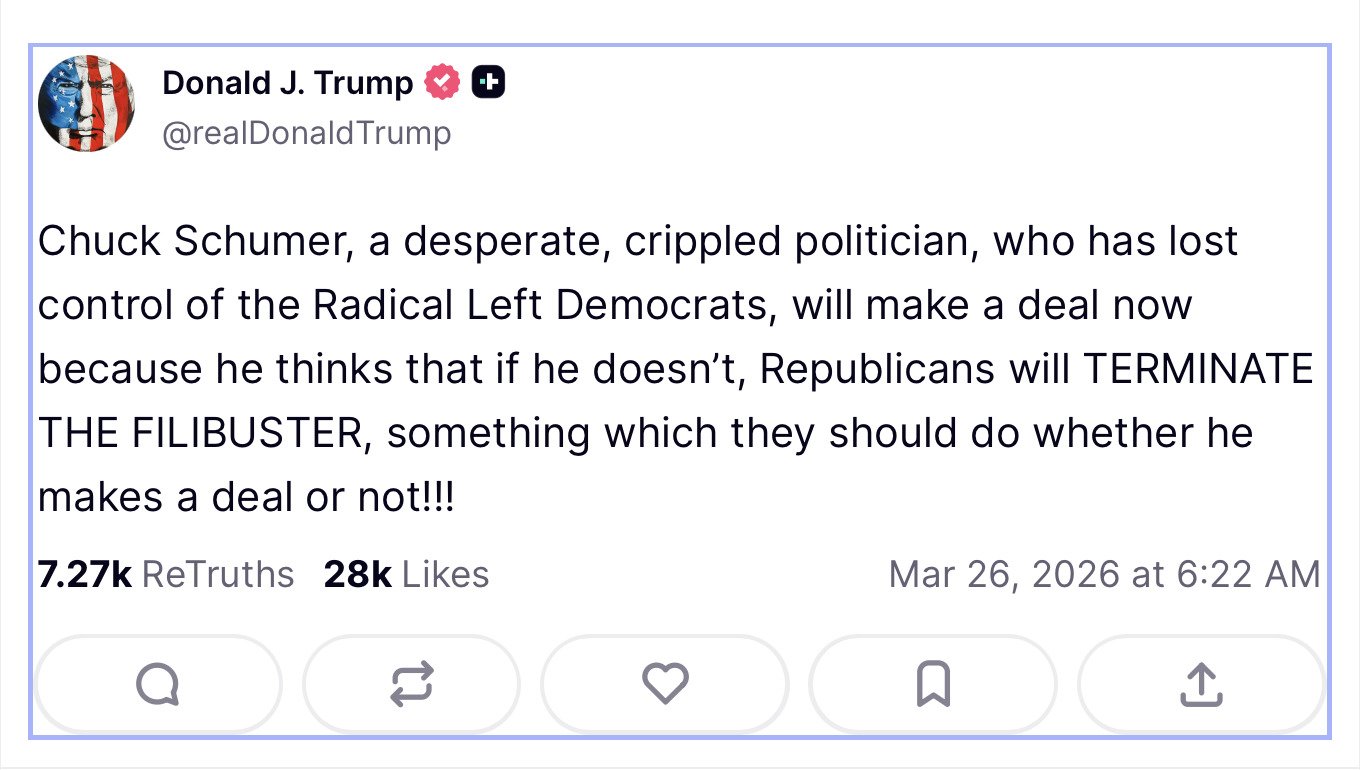 He also sent a message to Republican Senators to TERMINATE THE FILIBUSTER immediately, regardless of anything else that happens.
