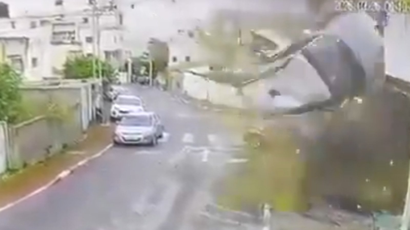 Similar images emerged elsewhere in the city, where a bomb landed right in front of a parked vehicle, damaging the car as it sent concrete soaring into the sky.