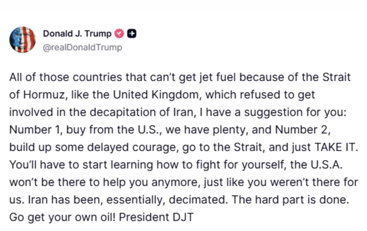 “All of those countries that can’t get jet fuel because of the Strait of Hormuz, like the United Kingdom, which refused to get involved in the decapitation of Iran, I have a suggestion for you: Number 1, buy from the U.S., we have plenty, and Number 2, build up some delayed courage, go to the Strait, and just TAKE IT,” Trump said.