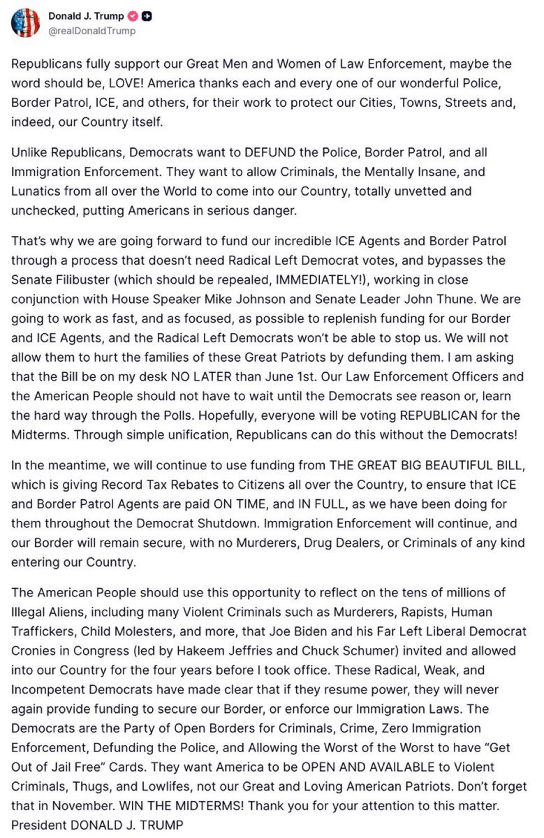 That’s why we are going forward to fund our incredible ICE Agents and Border Patrol through a process that doesn’t need Radical Left Democrat votes, and bypasses the Senate Filibuster (which should be repealed, IMMEDIATELY!), working in close conjunction with House Speaker Mike Johnson and Senate Leader John Thune. We are going to work as fast, and as focused, as possible to replenish funding for our Border and ICE Agents, and the Radical Left Democrats won’t be able to stop us. We will not allow them to hurt the families of these Great Patriots by defunding them. I am asking that the Bill be on my desk NO LATER than June 1st. Our Law Enforcement Officers and the American People should not have to wait until the Democrats see reason or, learn the hard way through the Polls. Hopefully, everyone will be voting REPUBLICAN for the Midterms. Through simple unification, Republicans can do this without the Democrats!