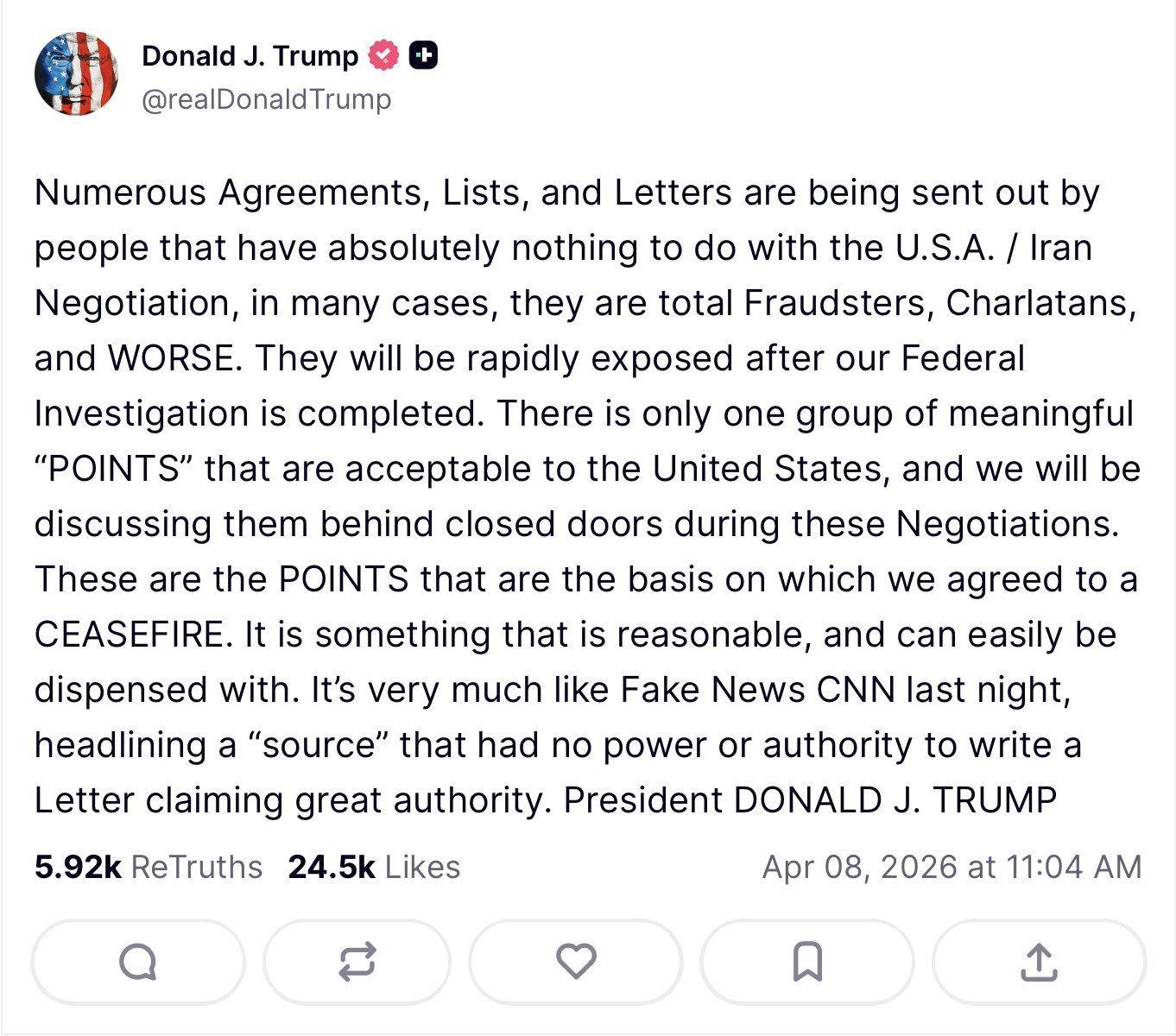 Since the ceasefire with Iran went into place last night, a “10-Point Plan” has been circulating online claiming to be the main ten points of a structure of a deal with Iran.