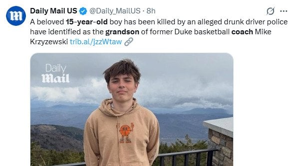 Joseph Savarino, whose mother is Kryzewski’s daughter Debbie, is facing a charge of driving while impaired after police said his SUV struck and killed a 15-year-old boy riding an e-bike at the intersection of Cole Mill Road and Wyndham Lane in Durham, N.C., on Saturday, April 18, according to local news stations WRAL, NBC affiliate WXII12 and CBS affiliate WNCN.