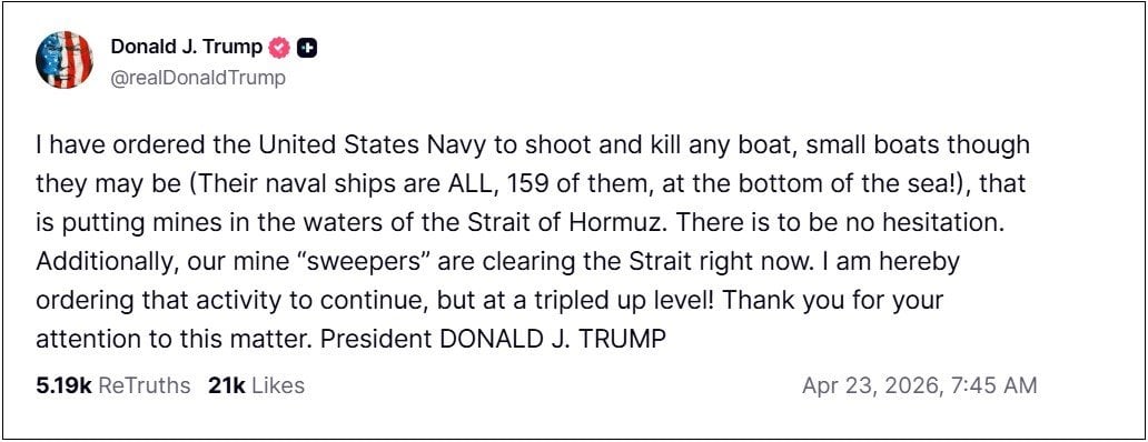 I have ordered the United States Navy to shoot and kill any boat, small boats though they may be (Their naval ships are ALL, 159 of them, at the bottom of the sea!), that is putting mines in the waters of the Strait of Hormuz. There is to be no hesitation. Additionally, our mine “sweepers” are clearing the Strait right now. I am hereby ordering that activity to continue, but at a tripled up level! Thank you for your attention to this matter. President DONALD J. TRUMP