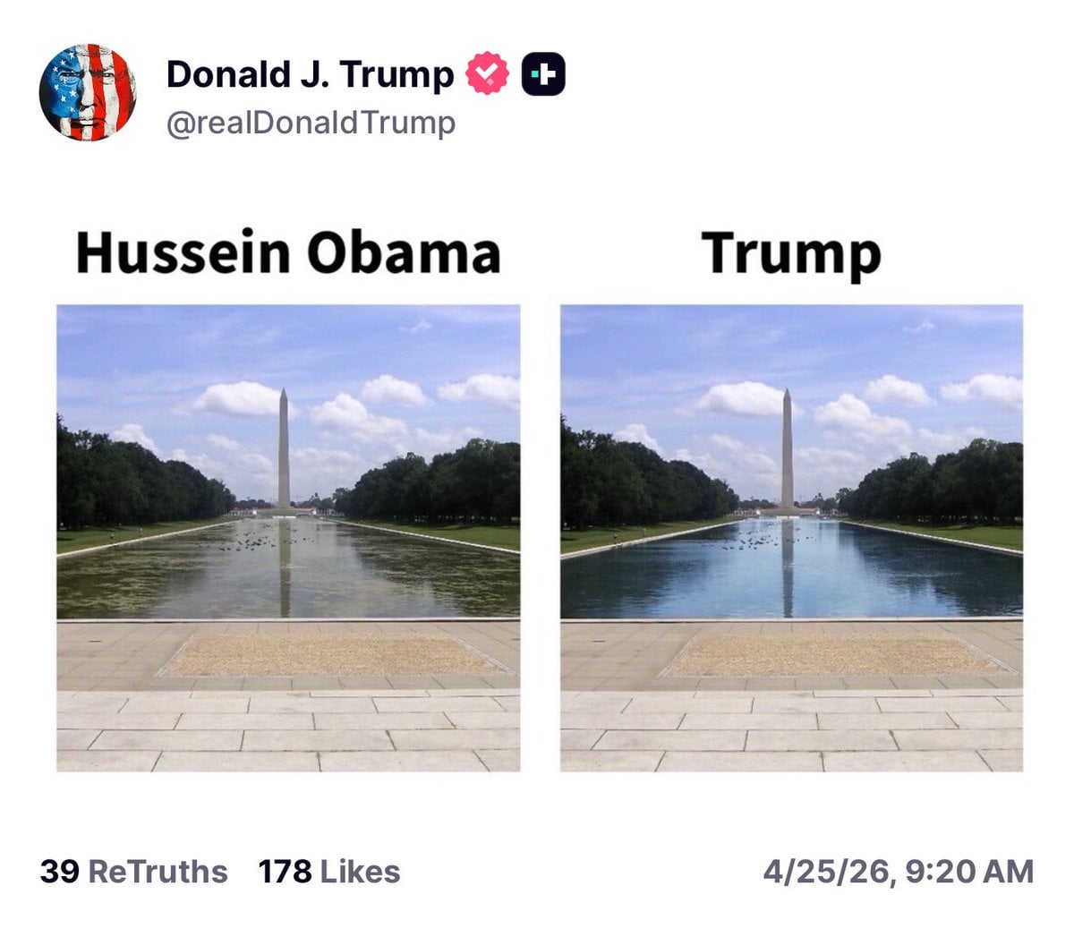 MOMENTS AGO: President Trump on Truth Social: “This is the Reflecting Pool at The Lincoln Memorial. Two thousand five hundred feet, the length of the tallest Building in the World. Starting the final phase of Renovation that was supposed to cost 301 Million Dollars, and take… pic.twitter.com/iUaxjVWpUQ