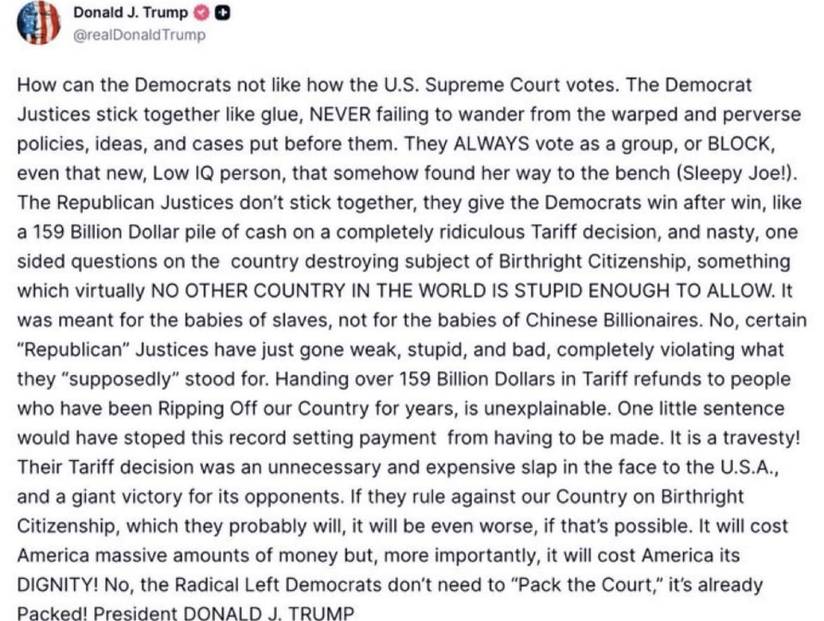 “How can the Democrats not like how the U.S. Supreme Court votes. The Democrat Justices stick together like glue, NEVER failing to wander from the warped and perverse policies, ideas, and cases put before them. They ALWAYS vote as a group, or BLOCK, even that new, Low IQ person, that somehow found her way to the bench (Sleepy Joe!). The Republican Justices don’t stick together, they give the Democrats win after win, like a 159 Billion Dollar pile of cash on a completely ridiculous Tariff decision, and nasty, one sided questions on the country destroying subject of Birthright Citizenship, something which virtually NO OTHER COUNTRY IN THE WORLD IS STUPID ENOUGH TO ALLOW,” Trump wrote on Truth Social.